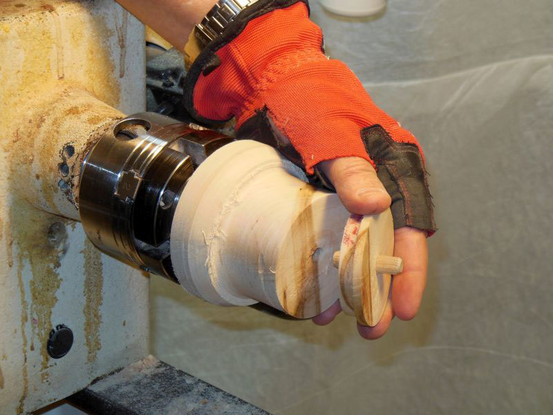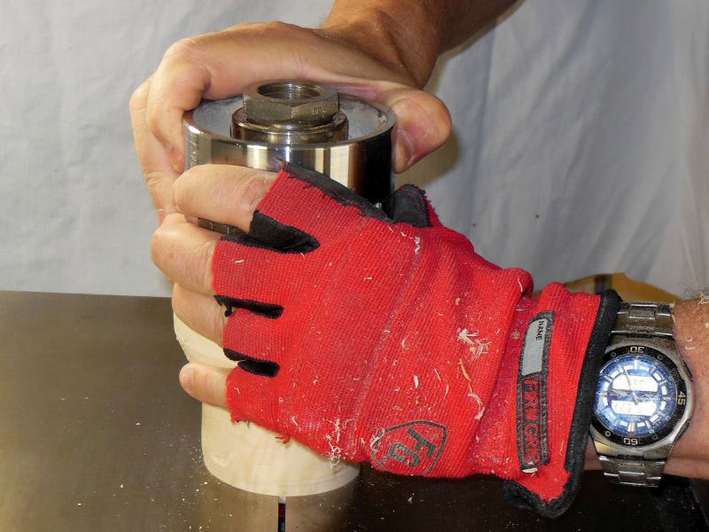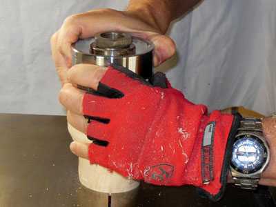 As the outer diameter of the work piece has been turned slightly oversize, the piece probably isn't fully seated inside the opening at this point; if you can rock it back and forth, it definitely isn't down far enough. Grab the work in both hands and rotate it (Figure #25).