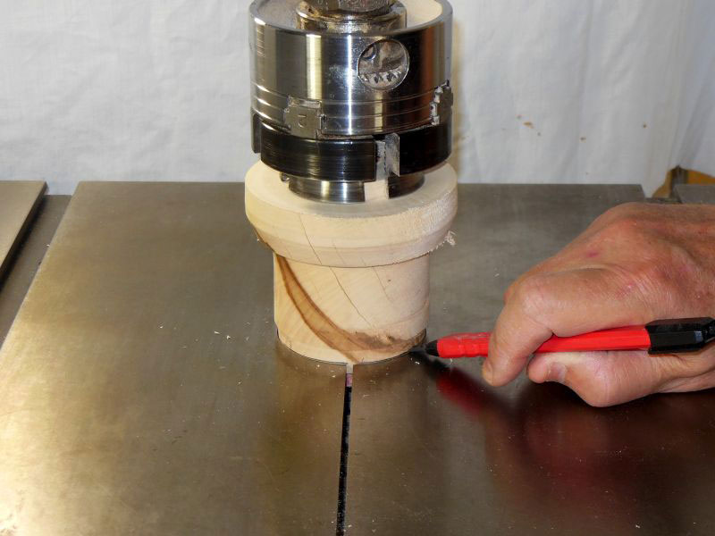 Remove the chuck and blank from the lathe – don't take the blank out of the chuck, just leave it mounted. Take the chucked blank to the bandsaw and place it on the table opening (Figure #20).