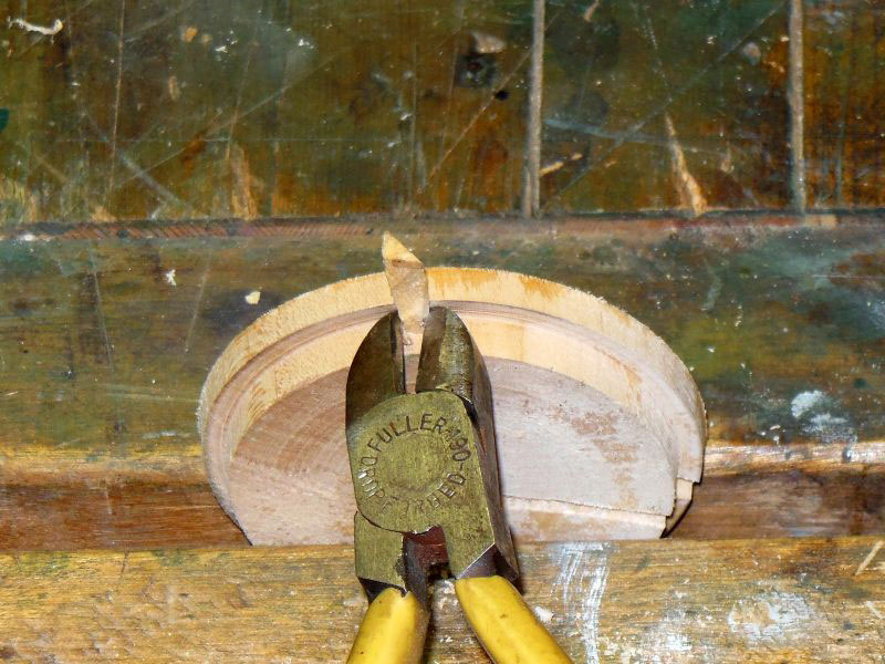 Use whatever tool is handy to nip off the splinter about an eighth of an inch above the surface of the insert (Figure #49). Do this to both holes.