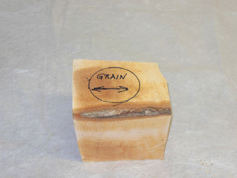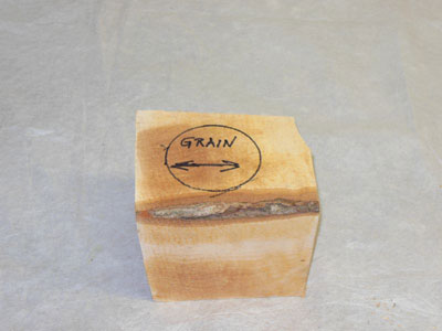 For additional strength, I decided to turn the insert so that the surface is long-grain wood, instead of cross-grain; that is, my turning blank is mounted as a bowl, rather than as a spindle. Figure #5 shows the face of the blank that will be turned with a tenon for mounting in a chuck. (Note: your turning blank will probably not come marked with the circle and arrow – I had to pay extra for this.)