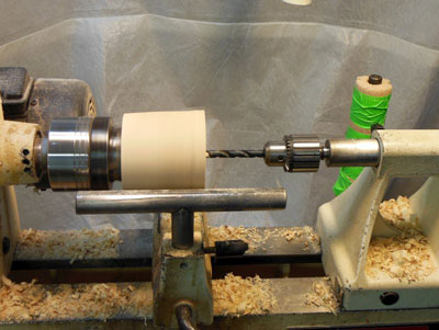 Using a Jacobs chuck in the tailstock, drill a 3/8" hole in the end of the blank (Figure #8).