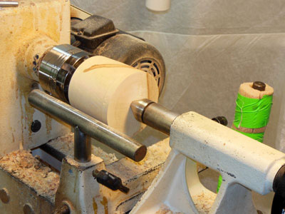 Start turning between centers, roughing down the blank to a cylinder (Figure #6).