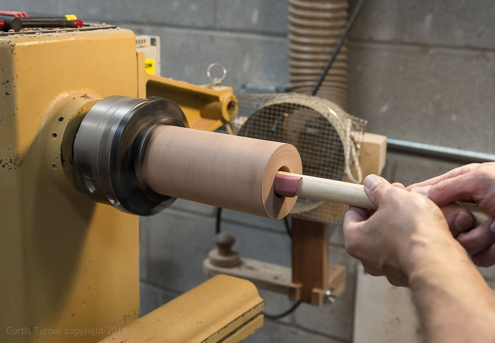 I used 120 to 400 grit sandpaper sanding with the grain while the lathe was off.