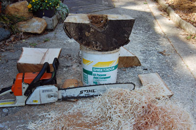 driveway. In the wood yard I have an old stump with a cove cut in it to stabilize the wood while I'm