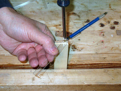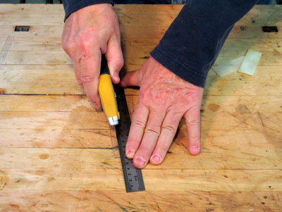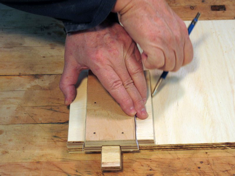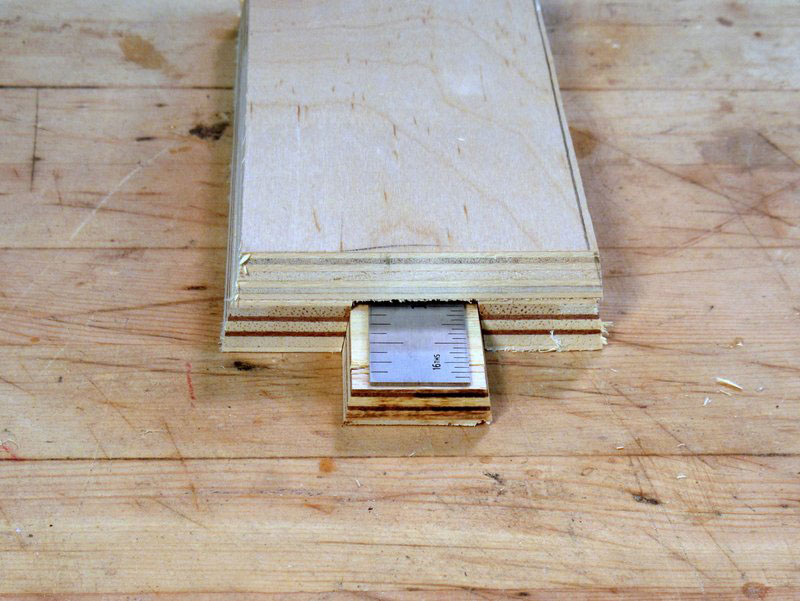 I held the glued-up ruler slide between two cleats on top of a piece of plywood and marked off the