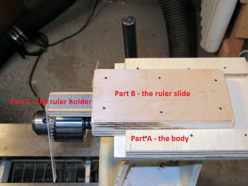 The ruler holder (part C) and the ruler slide (part B) both side between cleats that are beveled at 10