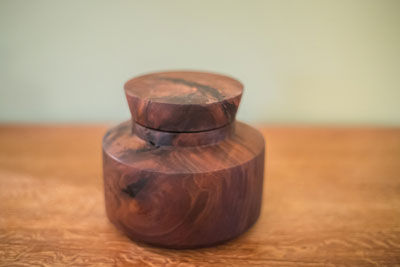 A claro walnut container with a lid from the same stock,