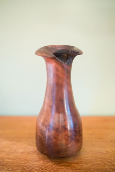 Walnut vase that incorporates natural edge. Finish is