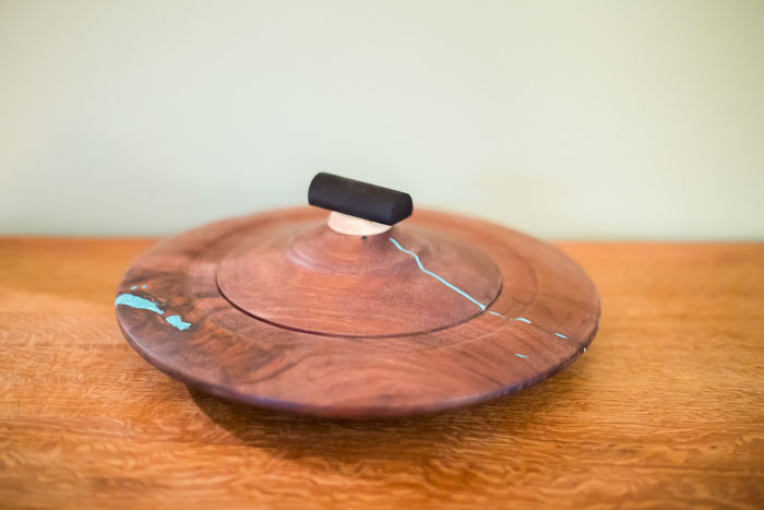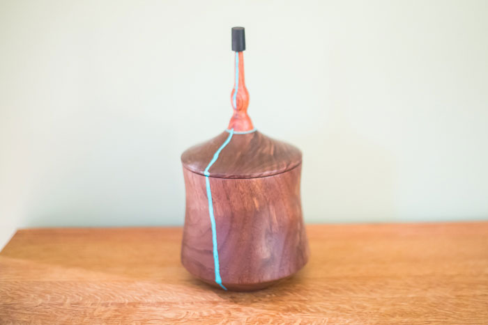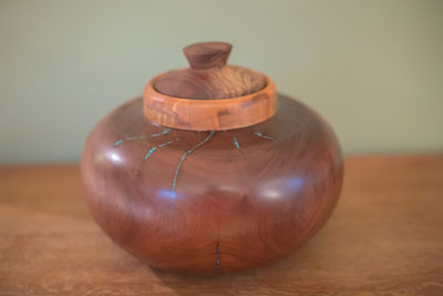 Walnut vessel with a turquoise inlay, an ebony top. I used