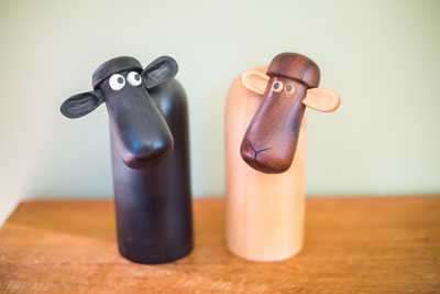 Two whimsical sheep turned on the lathe, ears were carved