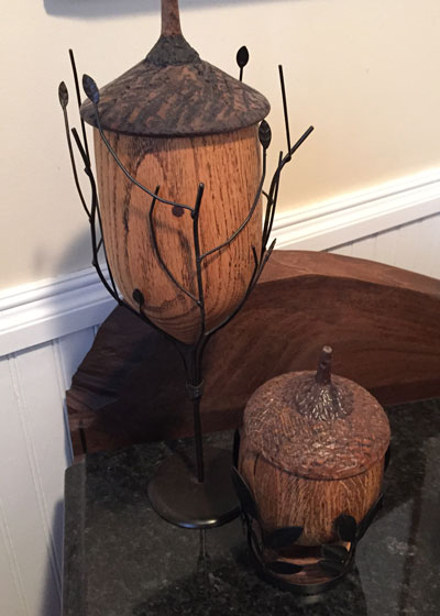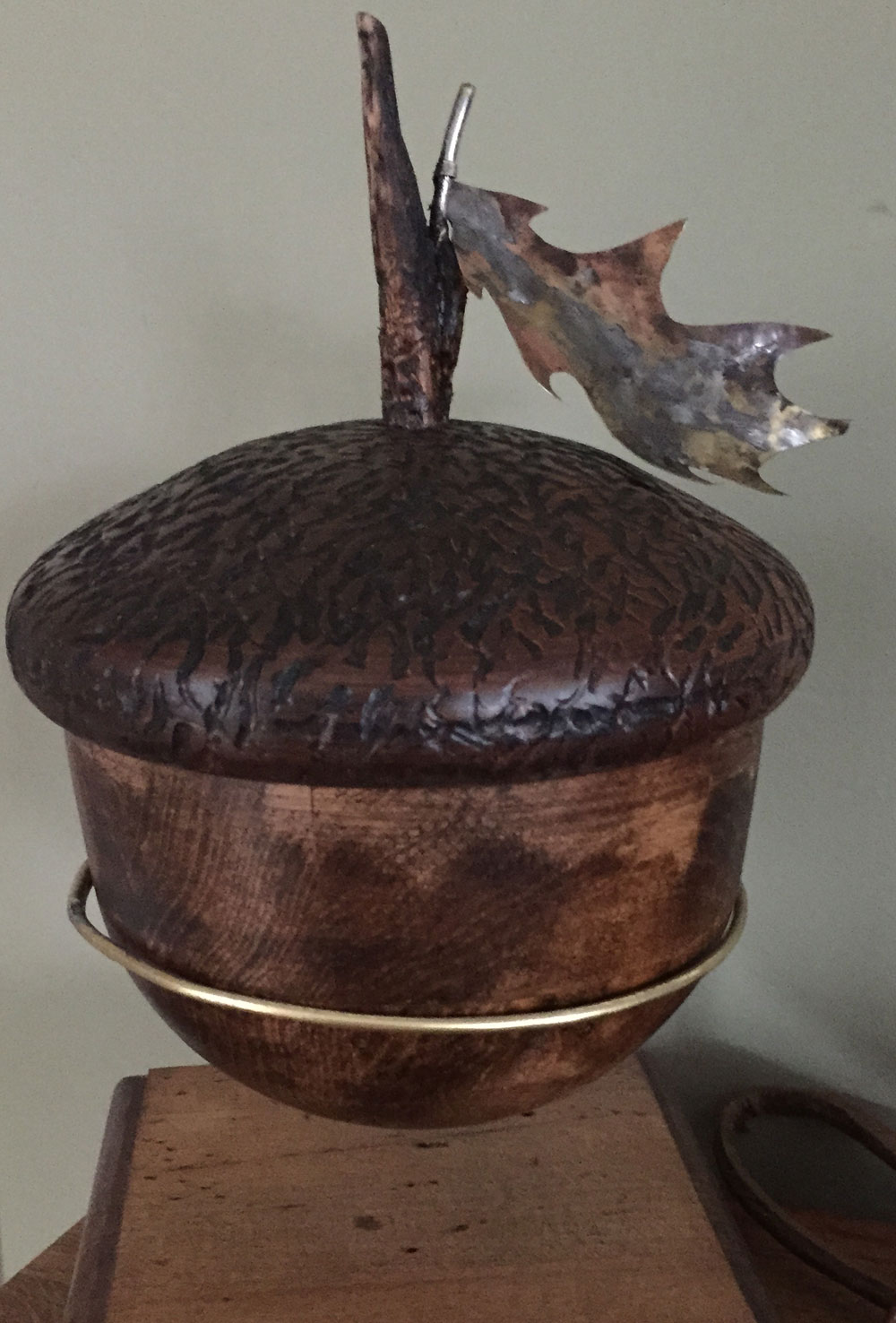 Turned acorn with brass leaf and carved top