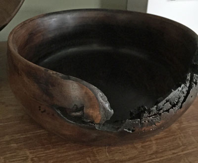 A walnut bowl with an incorporated inner bowl that has been