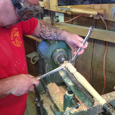 Once his handle was rounded and smoothed, we returned to my lathe to talk about the critical design issues of how to manage the bottom of the handle, where to put the swell and taper, how to create turned details (beads, coves, v-cuts) to make the critical transition between the handle and the head, and finally how to turn and size the tenon that would later join the two parts.