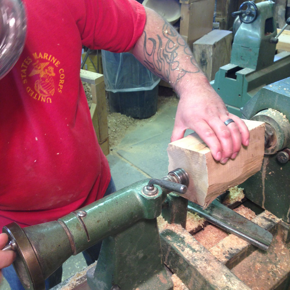 Following the closely guided steps of turning the handle and a new demonstration, Ryan mounted the blank for the gavel head between centers by himself.