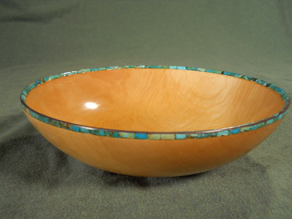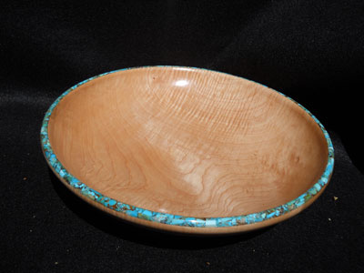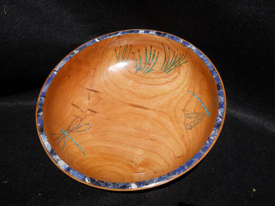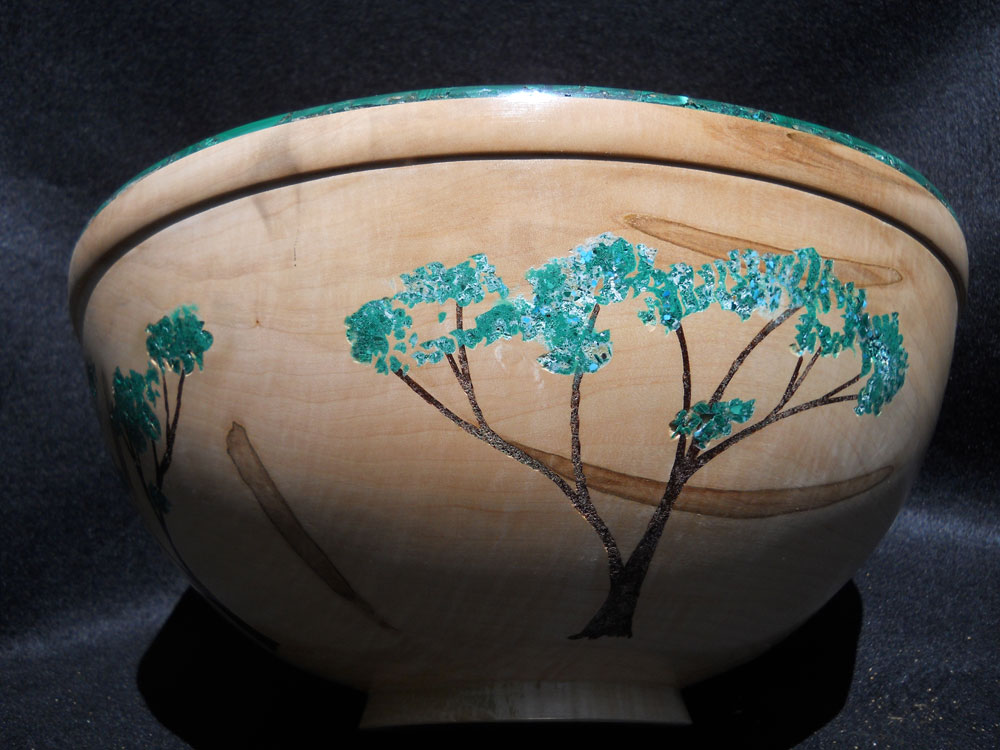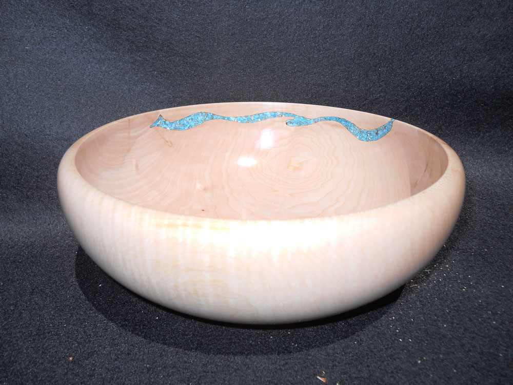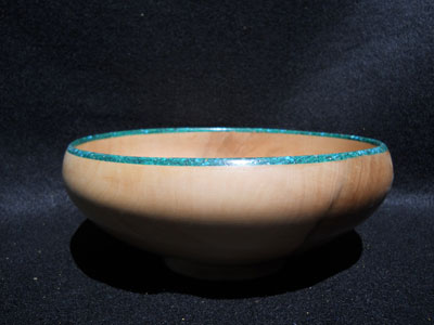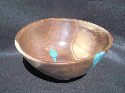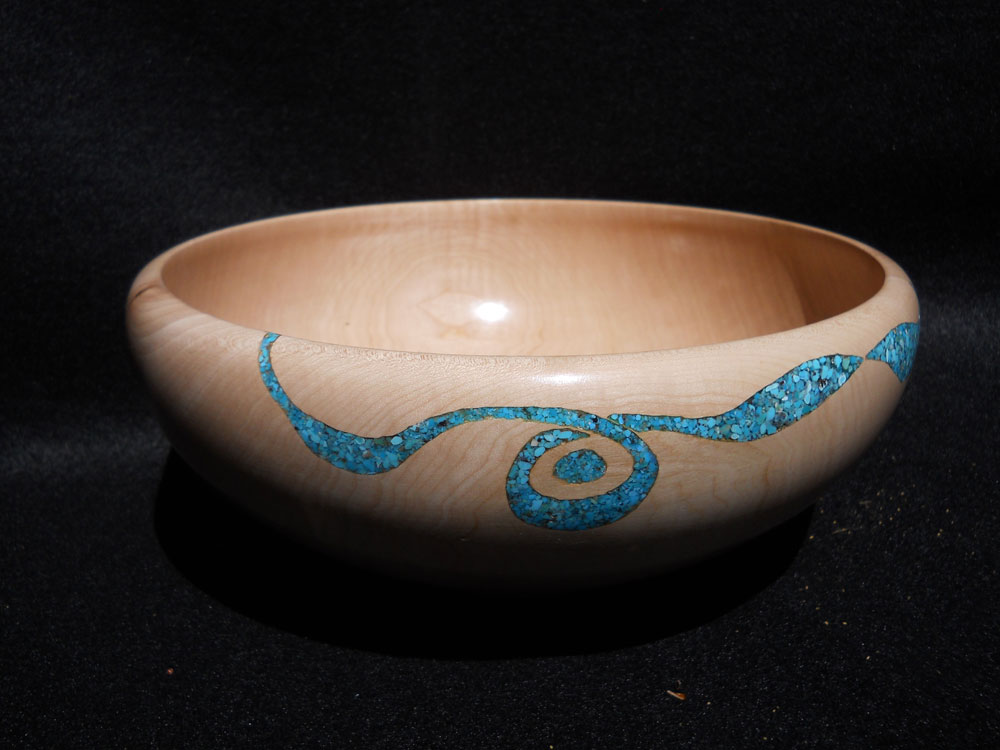 In 2009 I learned to turn at the Woodworkers Club in Norwalk, CT, after retiring from being a remodeling contractor. I started inlaying when a crack developed in a bowl. To save the bowl I designed an inlay of a tree that incorporated the crack, and the crack became part of a tree trunk. I became intrigued with inlaying and was soon incorporating inlaid designs into most of the bowls I made. I use malachite, turquoise, and marble, which I color using water soluble pigments.