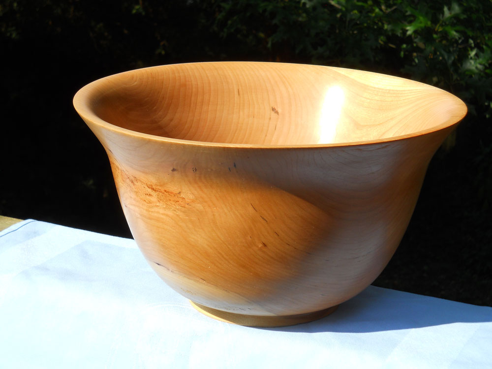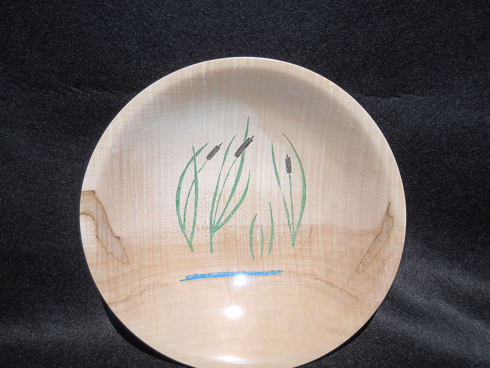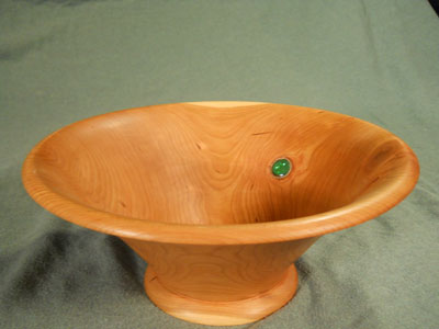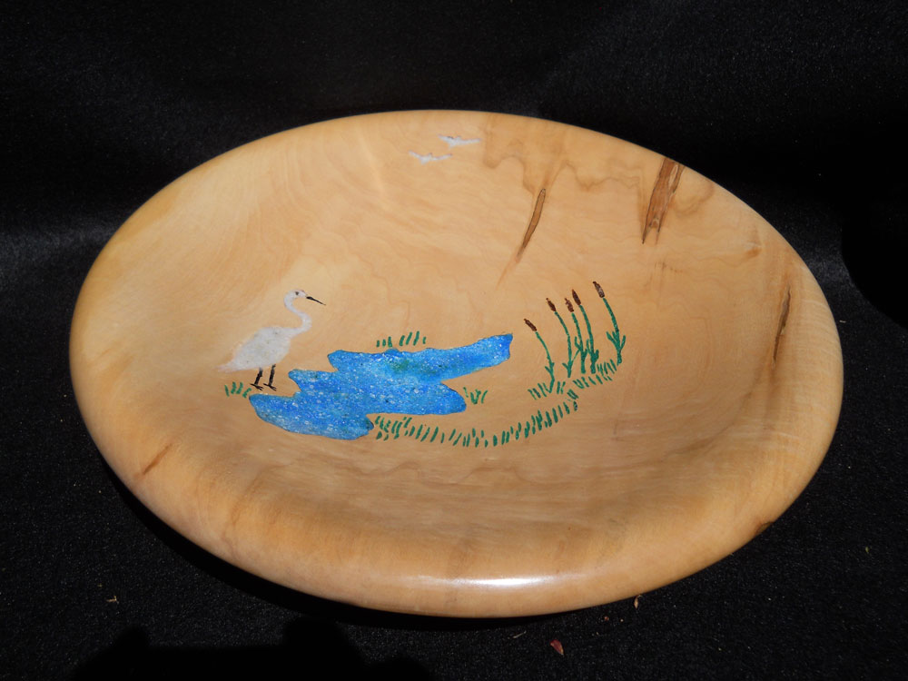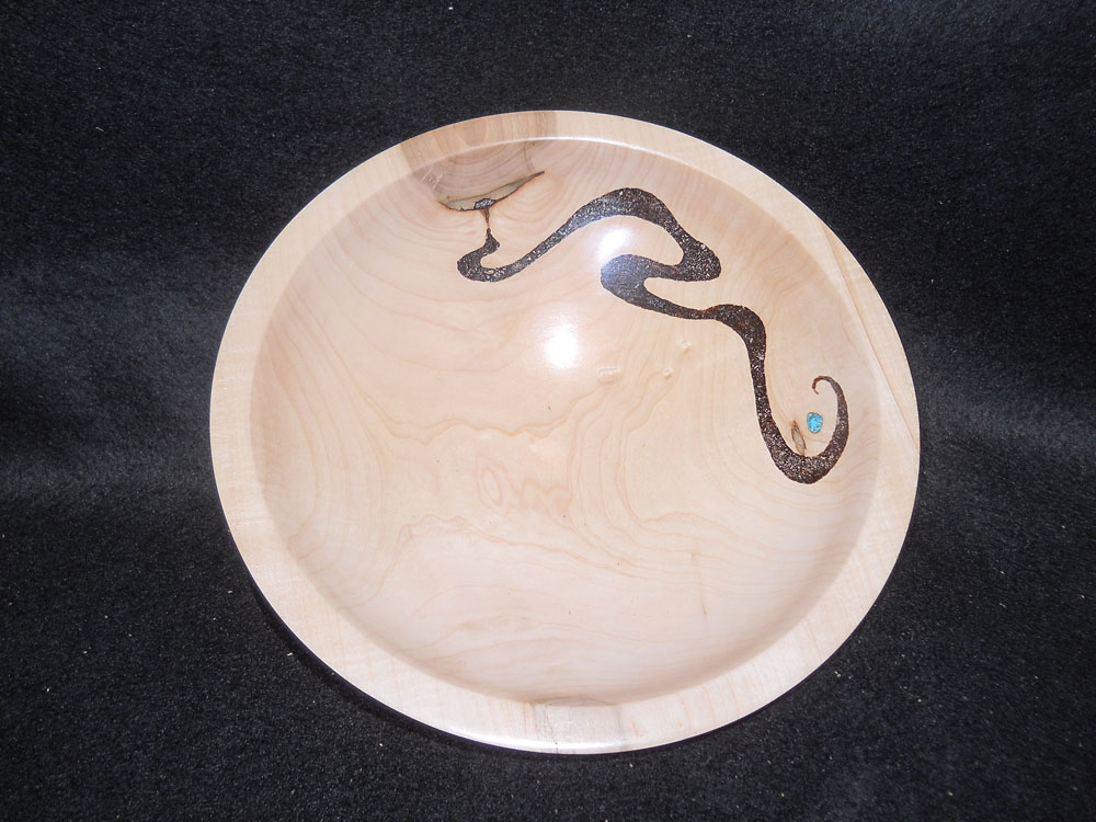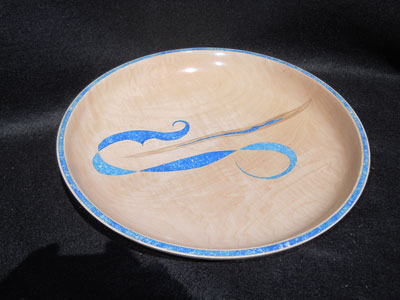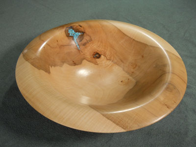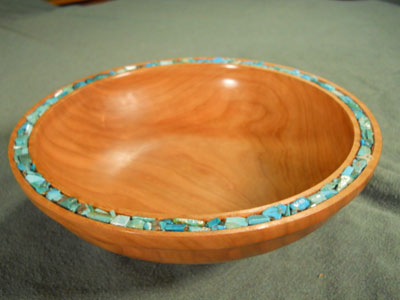 In 2009 I learned to turn at the Woodworkers Club in Norwalk, CT, after retiring from being a remodeling contractor. I started inlaying when a crack developed in a bowl. To save the bowl I designed an inlay of a tree that incorporated the crack, and the crack became part of a tree trunk. I became intrigued with inlaying and was soon incorporating inlaid designs into most of the bowls I made. I use malachite, turquoise, and marble, which I color using water soluble pigments.
