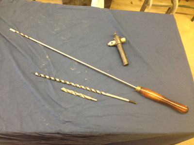 a 3/8" Bell-Hanger's Bit with a special grind, and two lengths of 1/2" drill bits.