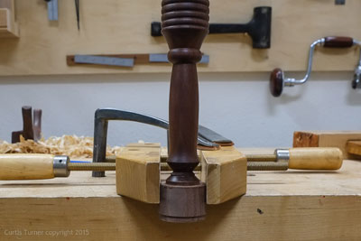 I clamped the turning in the wooden jaws. The clamp was held down by two