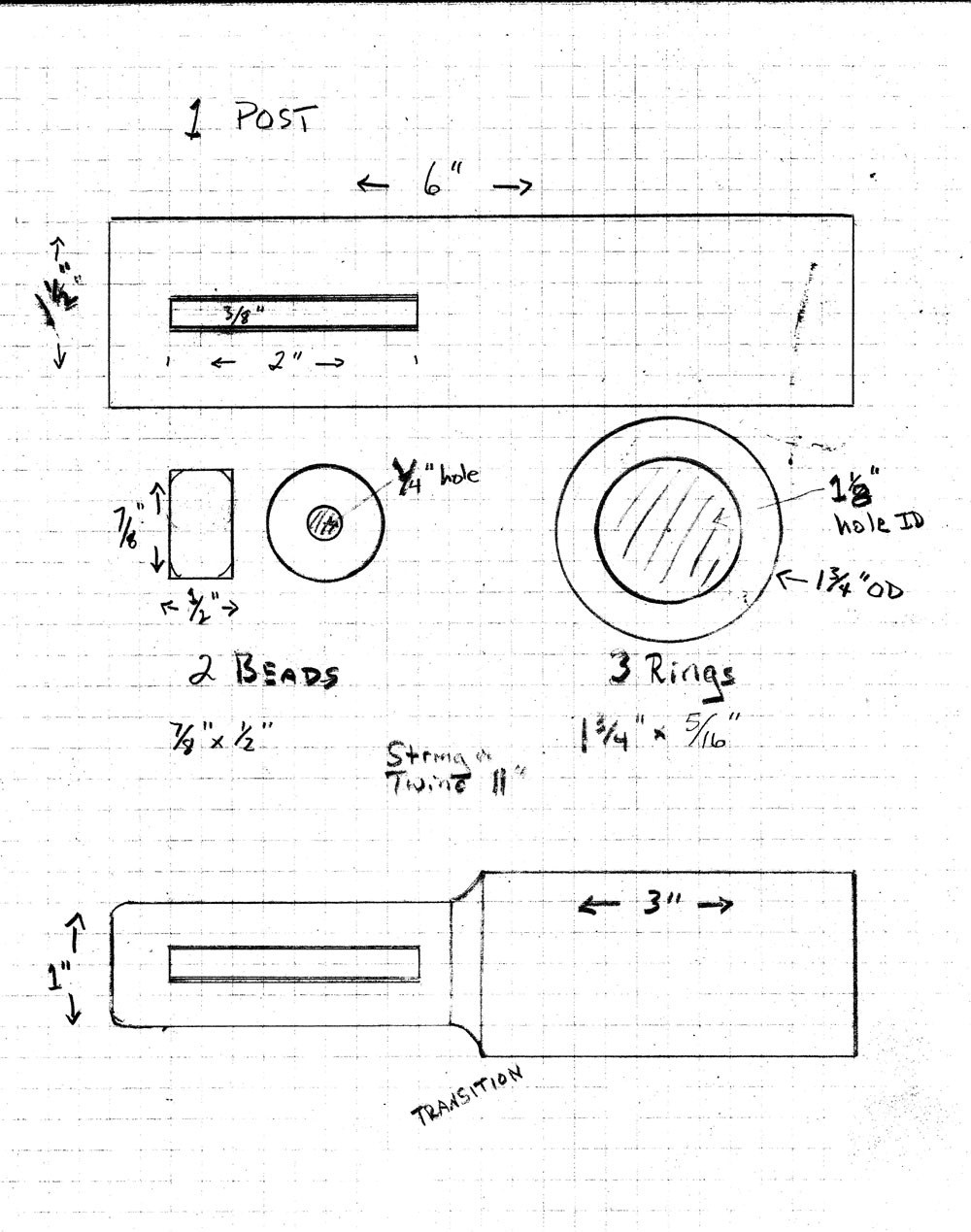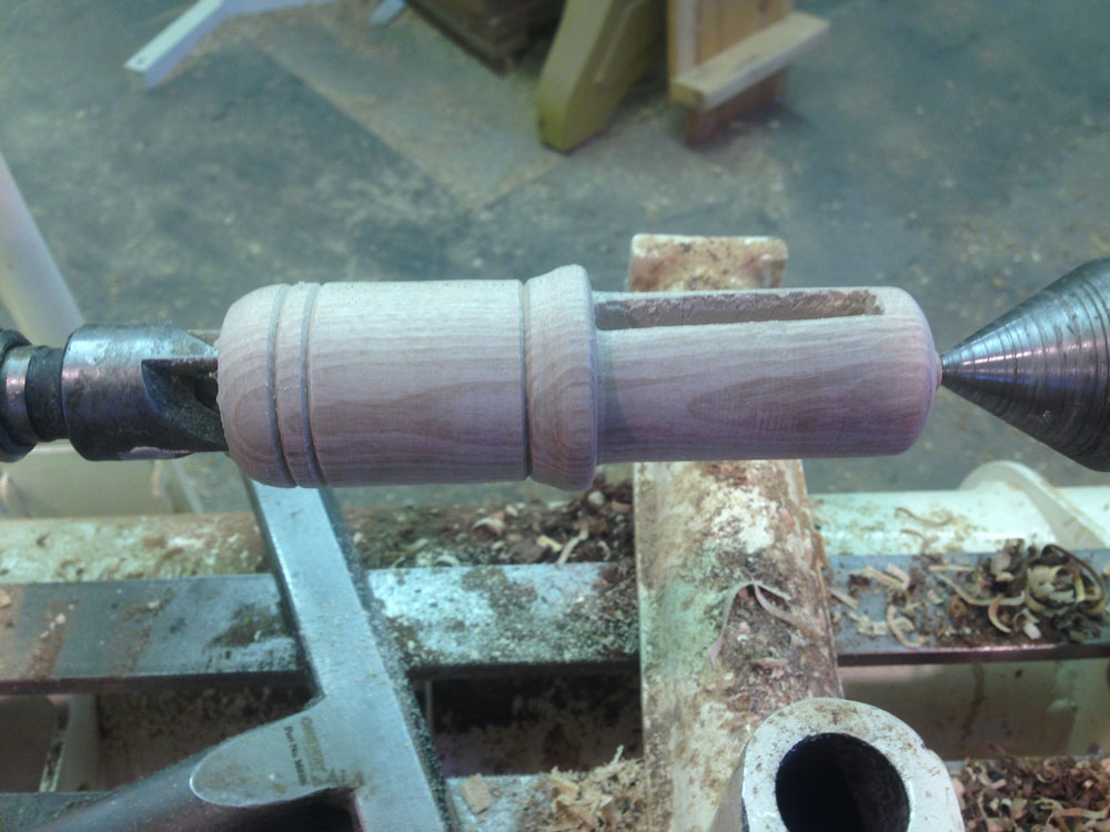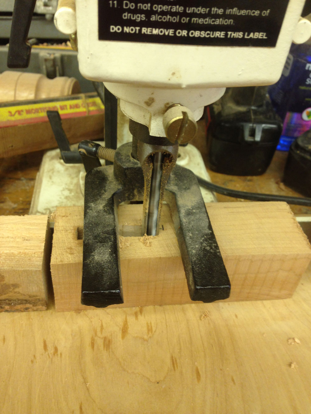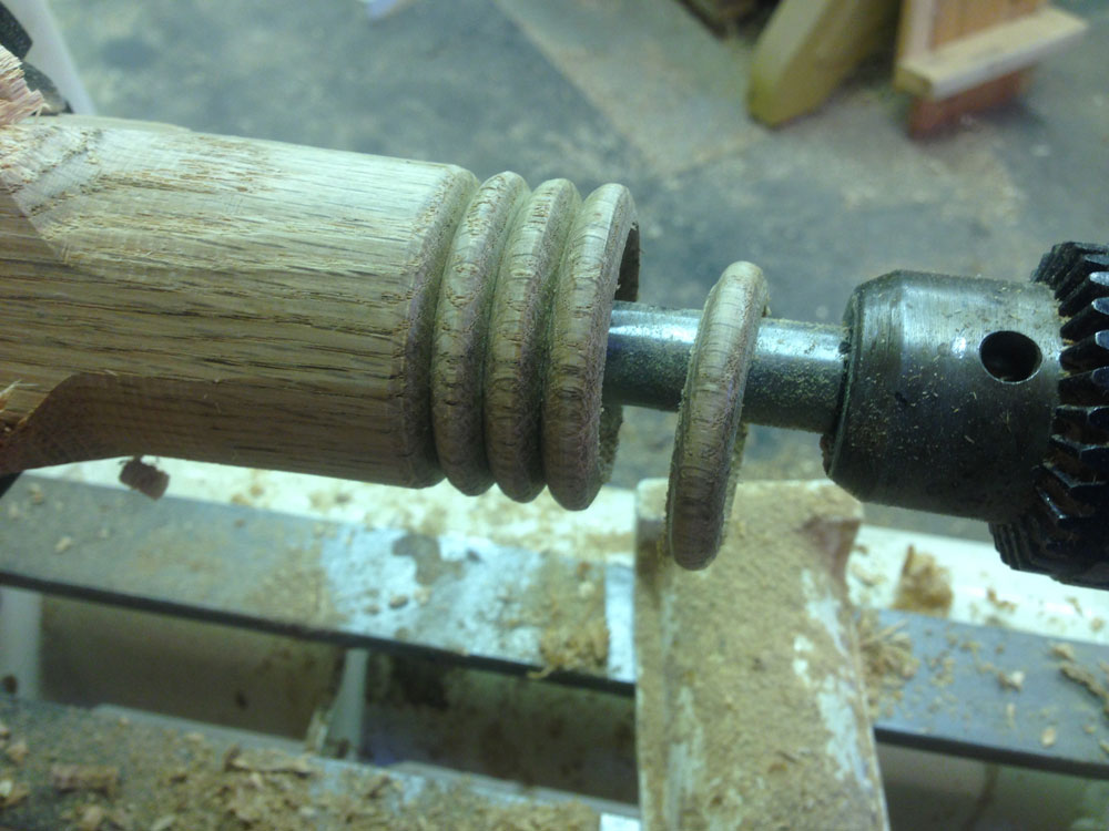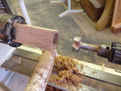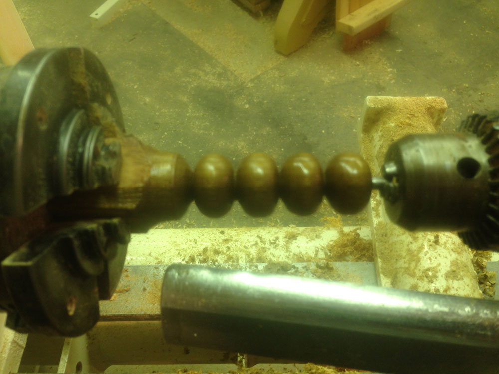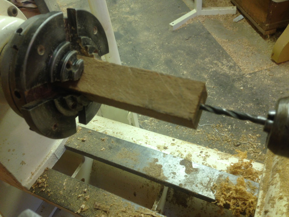 Once the post is turned and set aside to dry, the next step is to turn the beads. Depending on the diameter of the string you will ultimately use, select a larger drill bit and pre-drill the center hole.