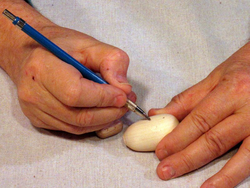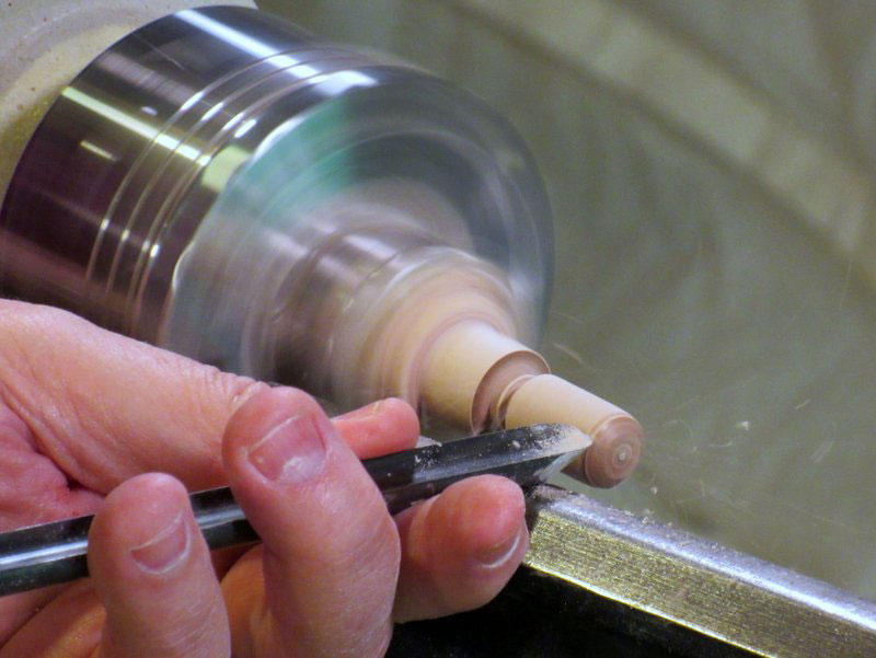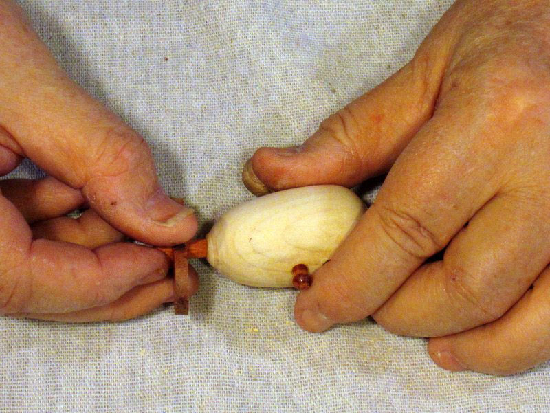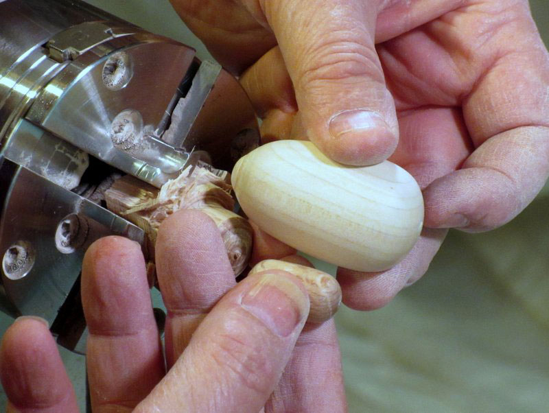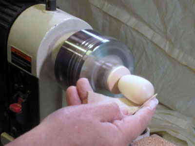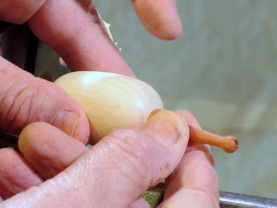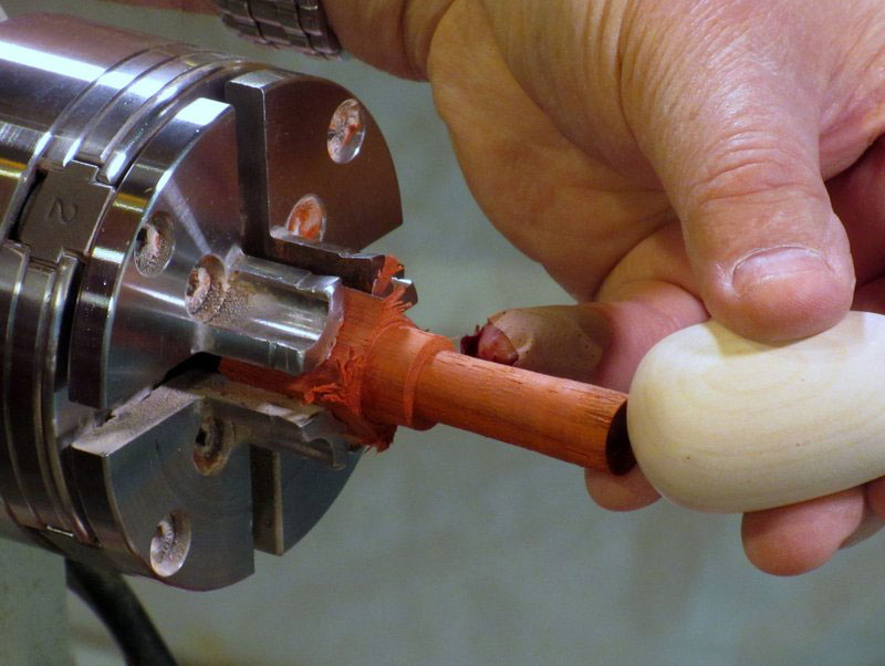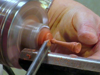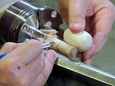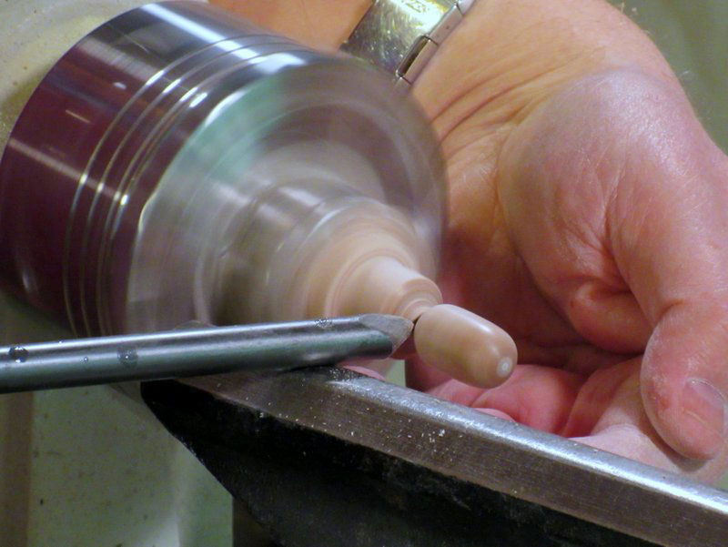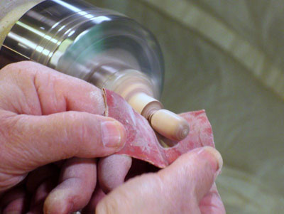 After some sanding, I formed a small ball at the forward end, and parted it off with my spindle gouge.