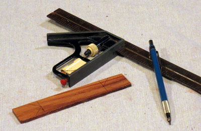 I started with a 5 inch piece of 1/8 inch thick padauk, cut on the tablesaw. On each end, I marked off two pieces with a 45 degree angle.