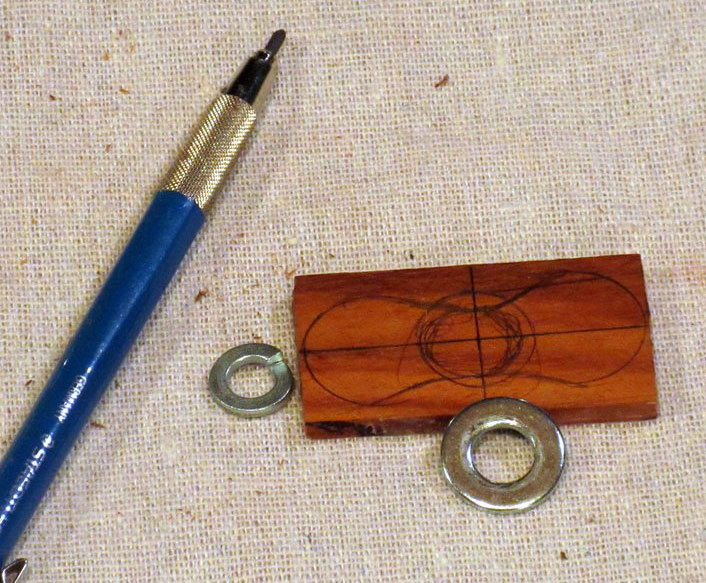 I made the propeller out of the same stock as the fins. I started with a 2 inch long piece, 1 inch wide, and 1/8 inch thick. I used a couple of small washers to draw the propeller shape.