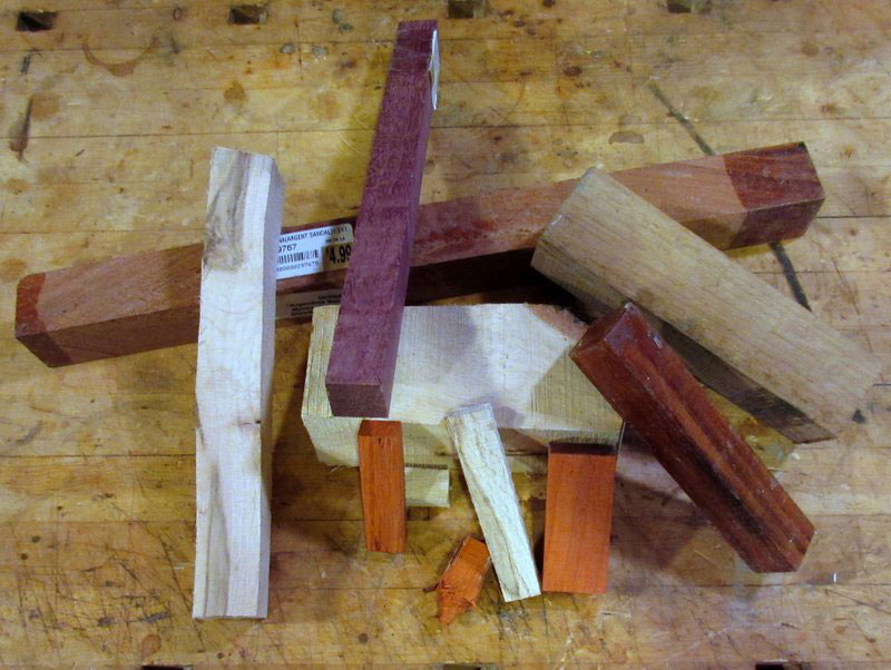 There are 5 components to be turned on the lathe and 2 to be cut from thin, flat stock. After full assembly, the overall length is 3 inches and the overall height is 2-1/4 inches. The largest piece, the lift envelope, is 2 inches long and 1-1/8 inches in diameter. So right away, you can guess this project isn't going to take a lot of turning stock. I started with a lot of scraps left over from this year's various projects.