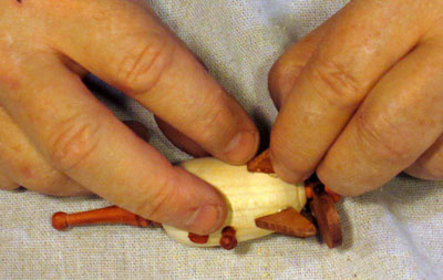 It needed to be sanded, of course. Normally, I sand the heck out of a small piece like this, going from 150 grit all the way down to 1000 grit. However, for this and other pieces in the ornament, I only sanded down to 400, because I decided not to do any finishing until after the whole ornament was assembled (I regretted that decision, as I will mention below).