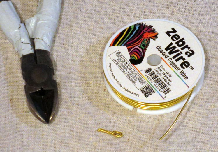 One last step…I formed a hanger loop from the brass-colored craft wire I had used for the struts. It is only 3/8 of an inch long, with a small eye at one end.
