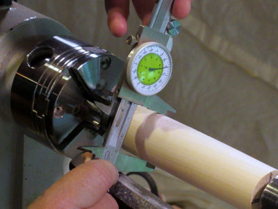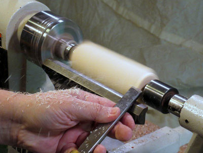 After roughing, I had a piece just under 1-1/2 inches in diameter. This is a good time to put a chuck tenon on both ends, which I cleverly forgot to do.