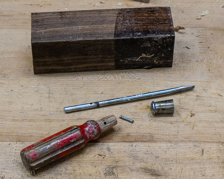 First, I selected a nice blank of Bocote. Next, I disassembled the screwdriver by removing the pin (see