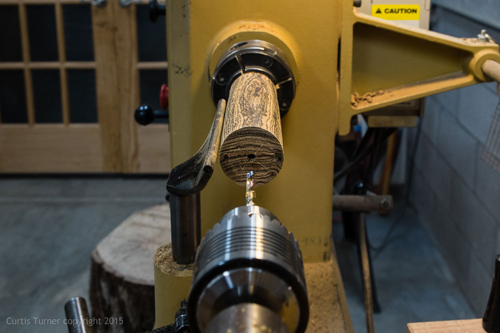 Now I needed to drill for the cross pin. First, I locked the spindle so the blank would not move. I then
