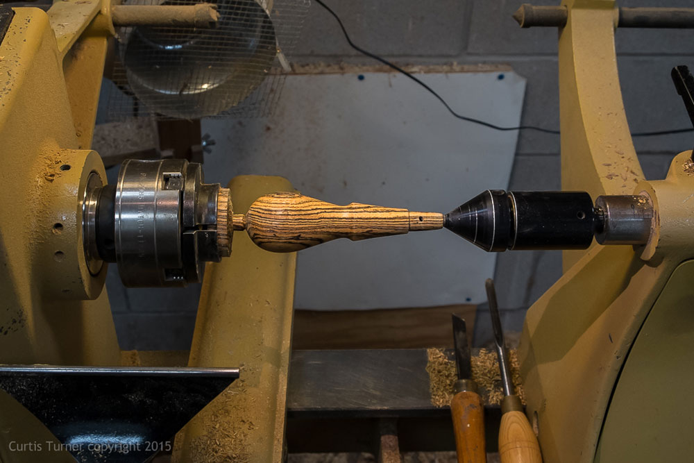 I then turned my attention to shaping the handle. I first mounted the cone center into the live center. I