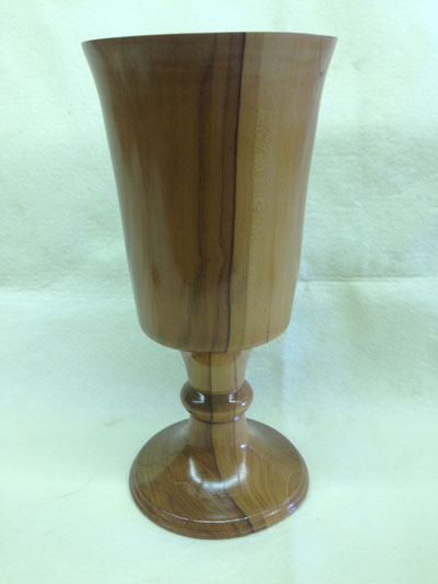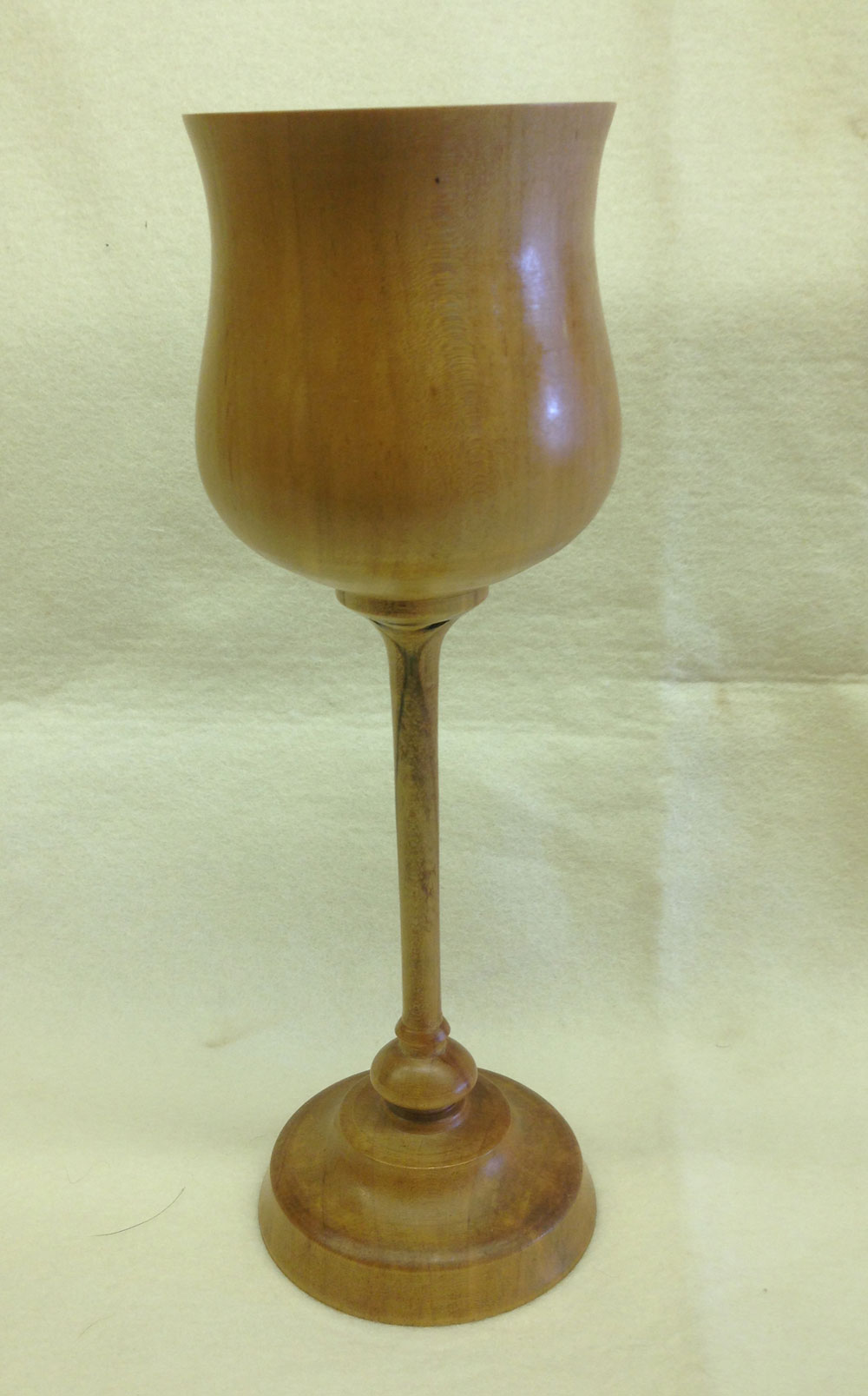 Similarly, the larger chalice (seen below), a copy of a historic pewter communion chalice, reflects the delicate balance between the diameters, height, and connecting transitions. The base must be of the "right" diameter to support the stem. The stem diameter, length, and taper must lead the eye to appear to properly support the bowl.