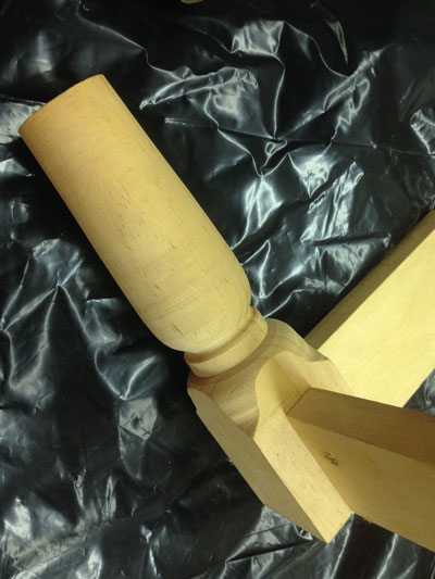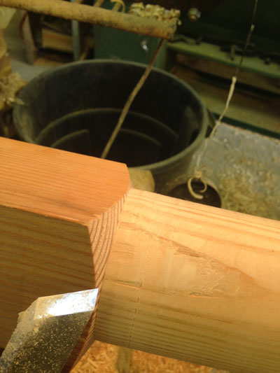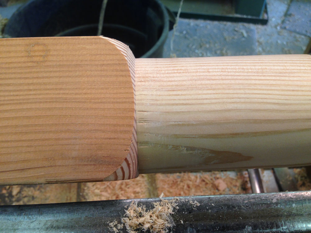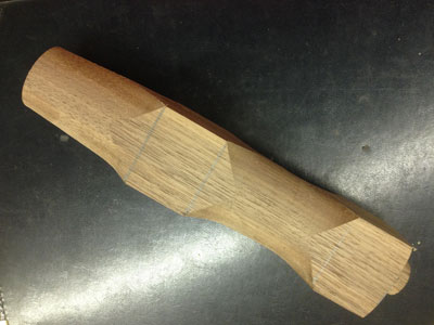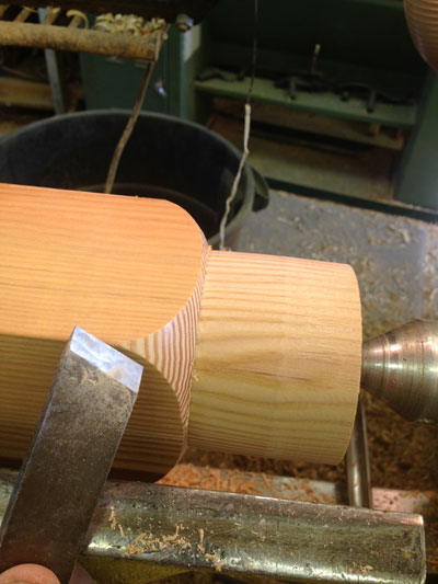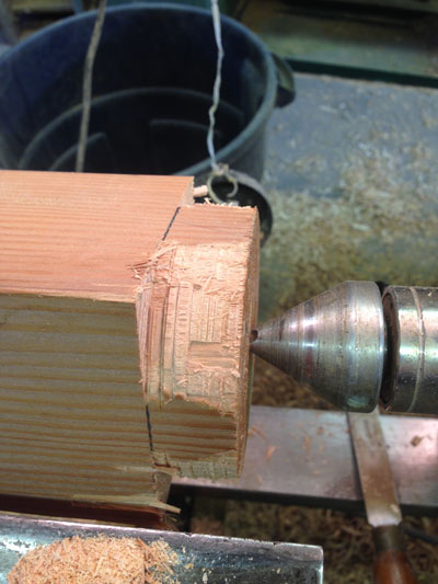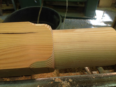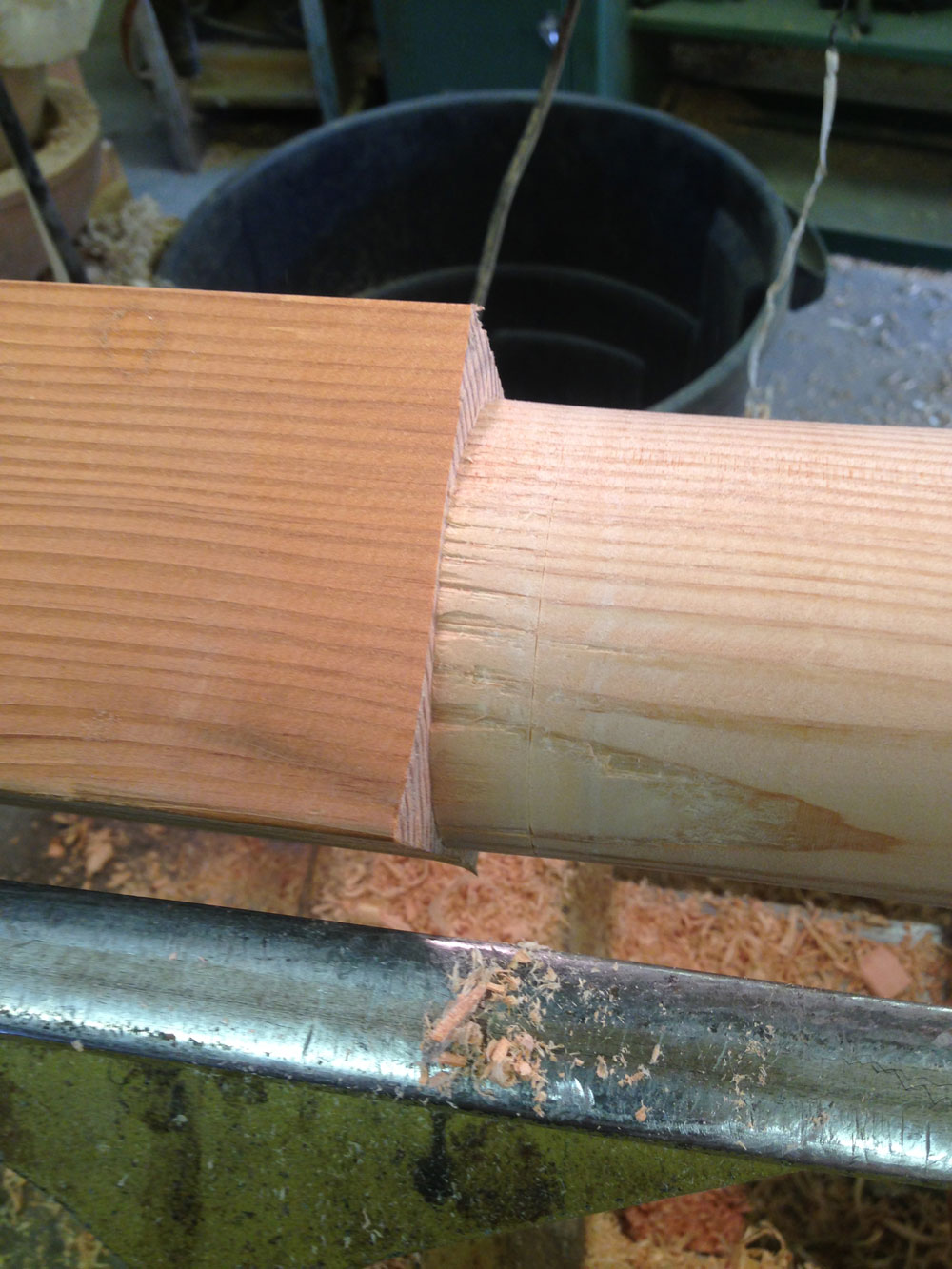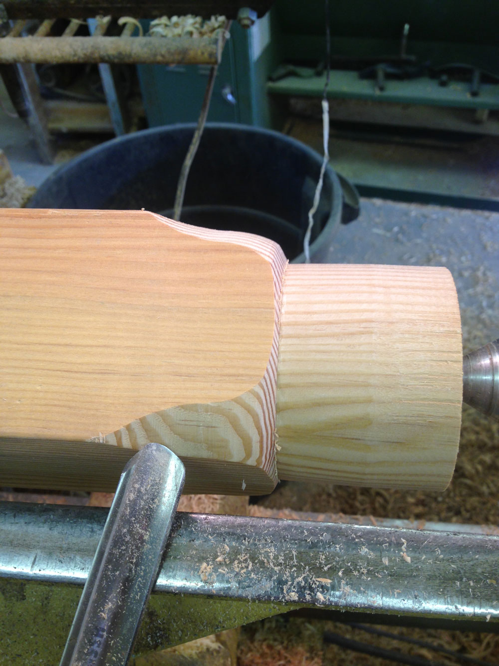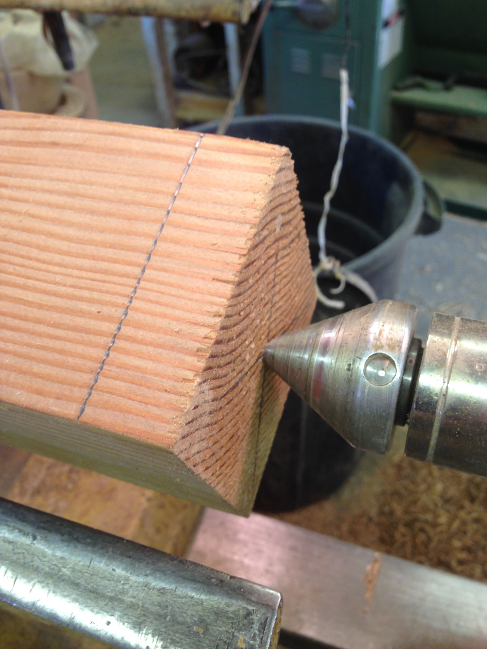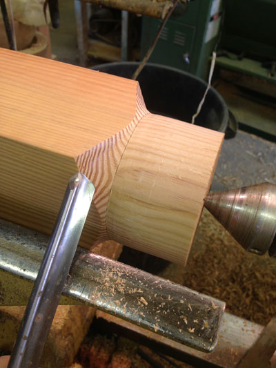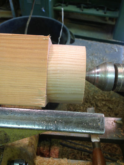 from square blank to the rounded leg. The prudent turner might wrap and mark the proposed joint position with masking or packaging tape to preserve the sharp pommel edge, especially when turning cedar, fir, or pine.