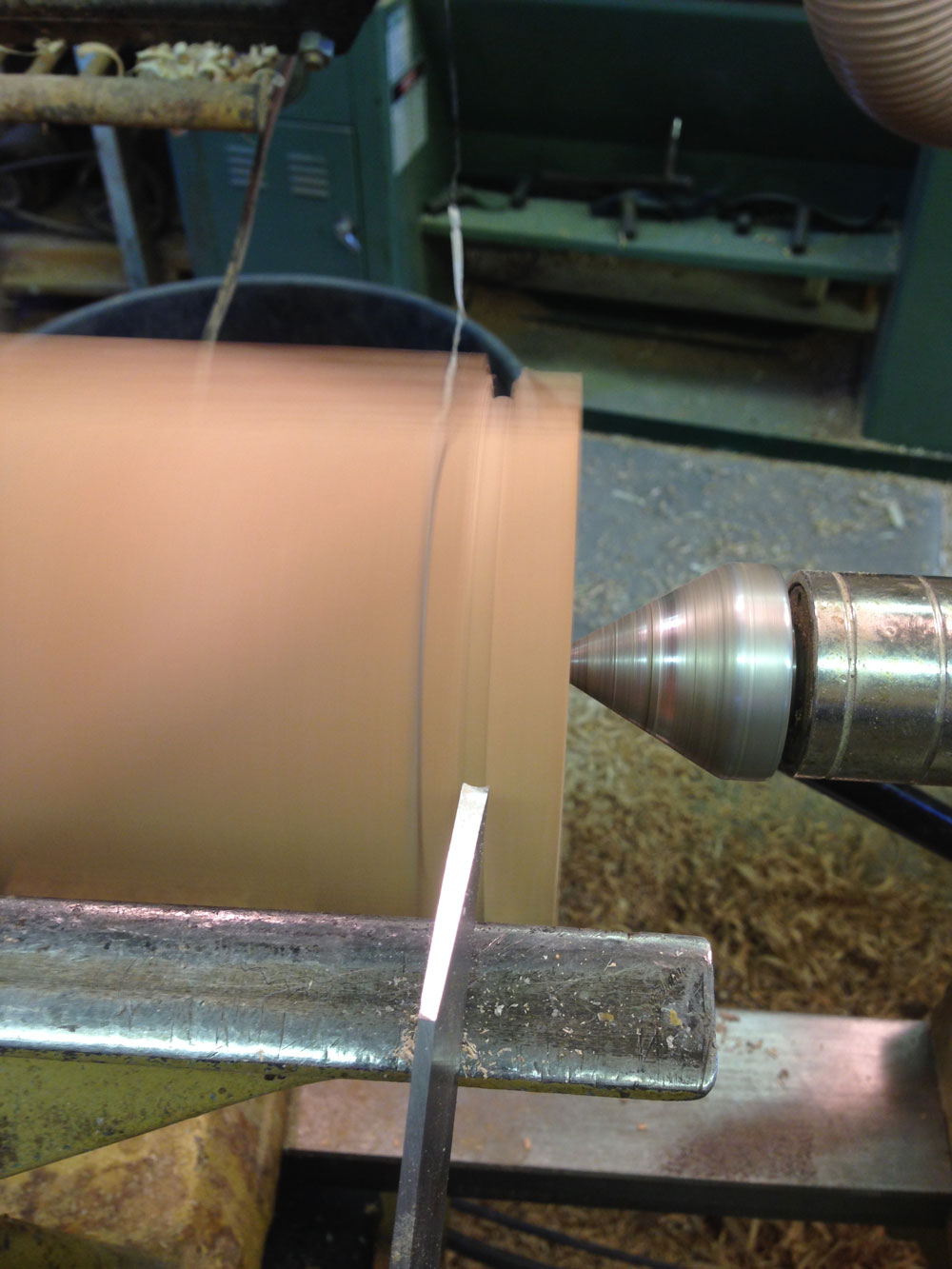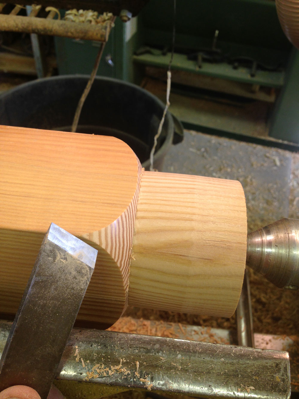 to make the transition from square-to-round, this will work best if the turner again starts by marking the crisp edge of the square blank with the skew and then applies the gouge.
