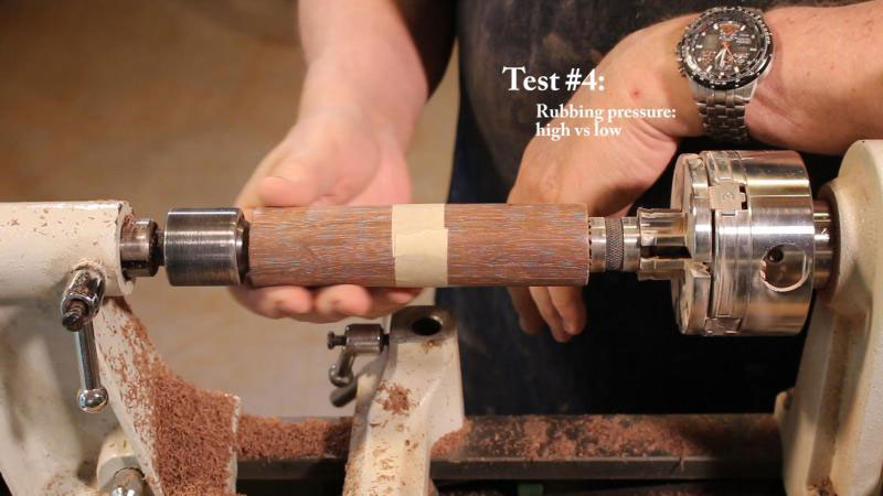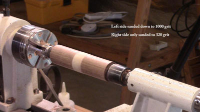 Again, the workpiece is "reset" to my starting specifications – bare wood, sanded to 1000 grit. For this test, I'm going to use a low lathe speed – 400 rpm – and distinguish the two sides with the degree of pressure I apply.