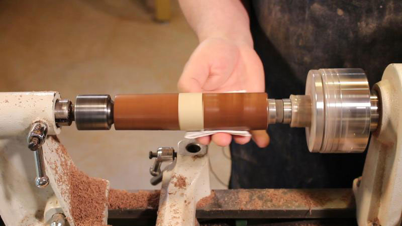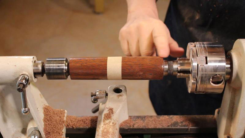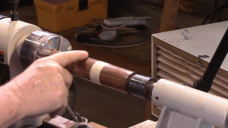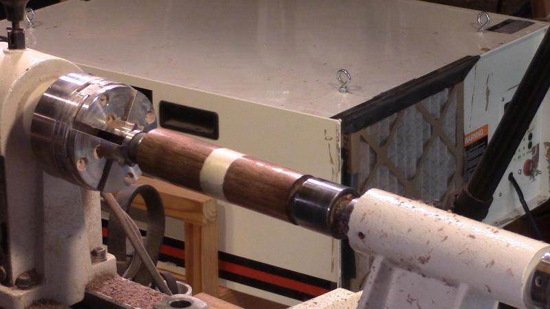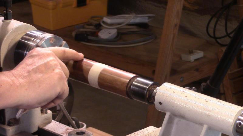 that I detail below, I am using a seven inch length of walnut, about 1-1/2 inches in diameter. Before each test (except the sanding test), I bring the surface down to bare wood, and then sand with 150, 240, 320, 400, 600, 800, and 1000 grit paper. I put a strip of masking tape in the middle of the workpiece so that I have two sides to experiment with.