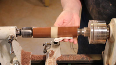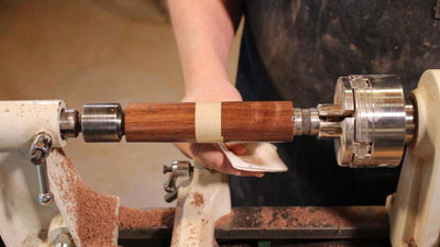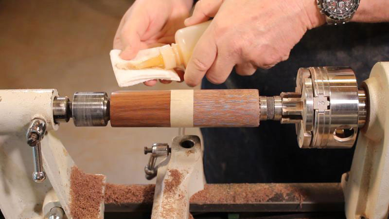 On my test piece, I sanded the left-hand side from 150 to 1000 grit, and the right-hand side with only three grits – 150, 240, and 320. I am using one-half of a paper towel to apply the friction polish to both sides. With the lathe off, I put the first coat of polish on the workpiece, both left and right sides, with a paper towel.