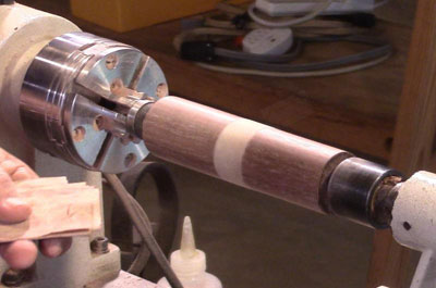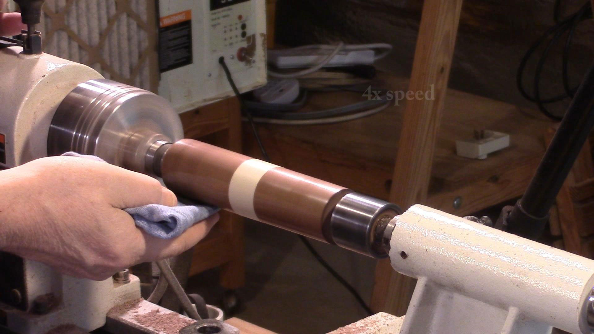 For this test, I once again have my walnut workpiece, cut back to bare wood and sanded to 1000 grit. The tailstock side will get polished at high speed, about 2700 rpm. The headstock side will get polished at 400 rpm.