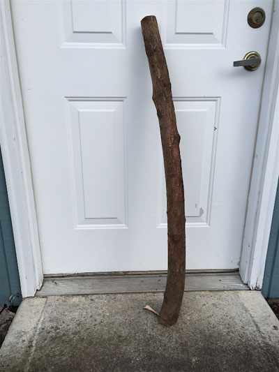 The completed chisel is below. The dark parts of the wood are bark where the curvature is. The handle itself is 21" long and the overall length of the piece is 29".