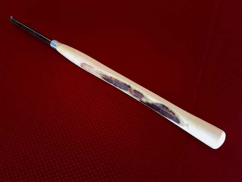 A while back I had to cut down a rather large Japanese Red Maple Tree that had decided to end its life. The trunks (there were several) were about 3" in diameter and had a curve to them. They were no good for bowls or lumber certainly, but the wood was creamy white and quite beautiful so I thought they might make nice handles for things such as ice cream scoops and pizza cutters. But when the time came to actually put the stuff to use I had an epiphany of sorts. Why only cut short handles when I could cut a long one for an entirely different purpose? Why not turn a custom handle for a carbide chisel?