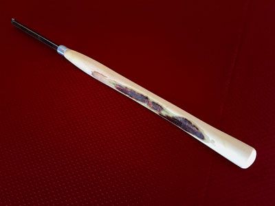 Then I epoxied in the steel rod making sure that the thing was positioned properly in the handle. The top has to be 90-degrees to the curve and facing up. Make sure you place the curve on the correct side of your body depending on whether you're right or left handed. Epoxy is not a forgiving glue. You can't correct this later.