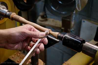 making two vee cuts with the skew. I then held a wire burning tool against the spinning wood to burn in