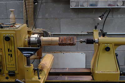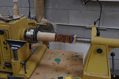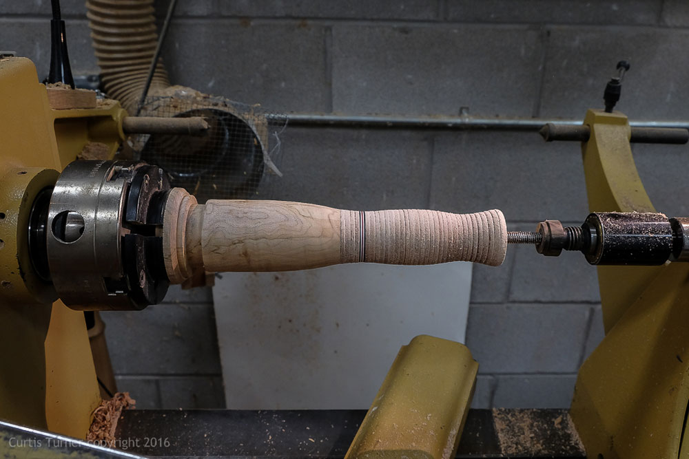 into the maple blank, inserted the rod, and used the tail stock sans drive center to apply clamping pressure. I let this cure overnight.