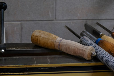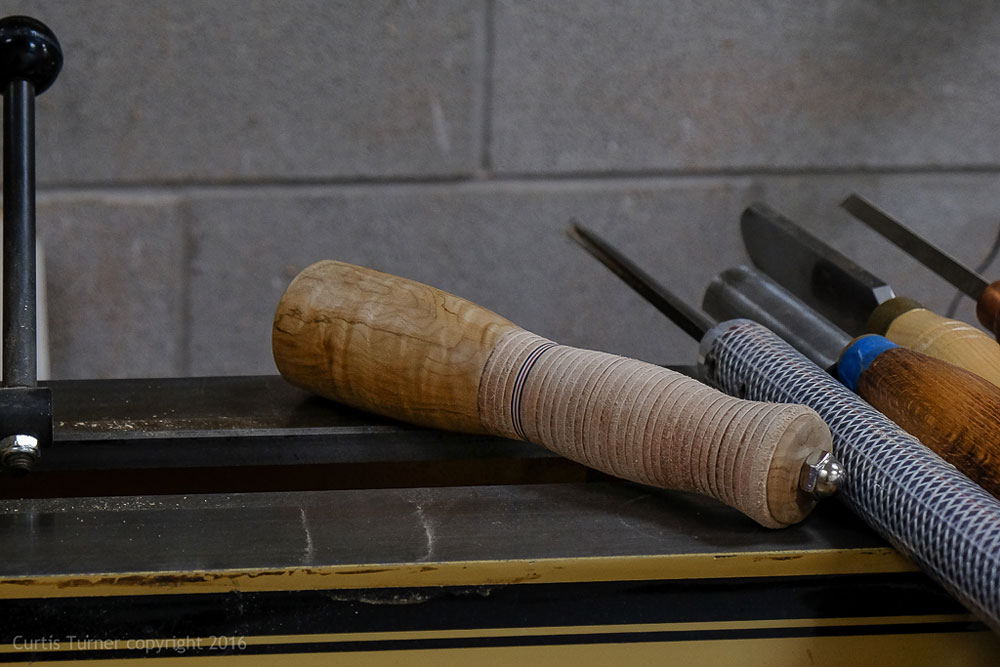 It worked! I tested various speeds and tools. I tested a skew, scraper, spindle gouge and a bowl gouge. I found the spindle roughing gouge and bowl gouge worked the best. The scraper worked surprisingly well. The best speed range was about 1,200 -1,400 rpm. I also sanded the handle in the same manner I would for any wood spindle.