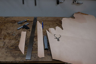 The first step in actually making the project was to cut enough leather to make a handle. I started by making a simple jig to cut consistent 2x2" squares.