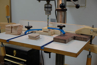 I used the cutting jig on the drill press to make accurately centered 3/8" holes in each square.