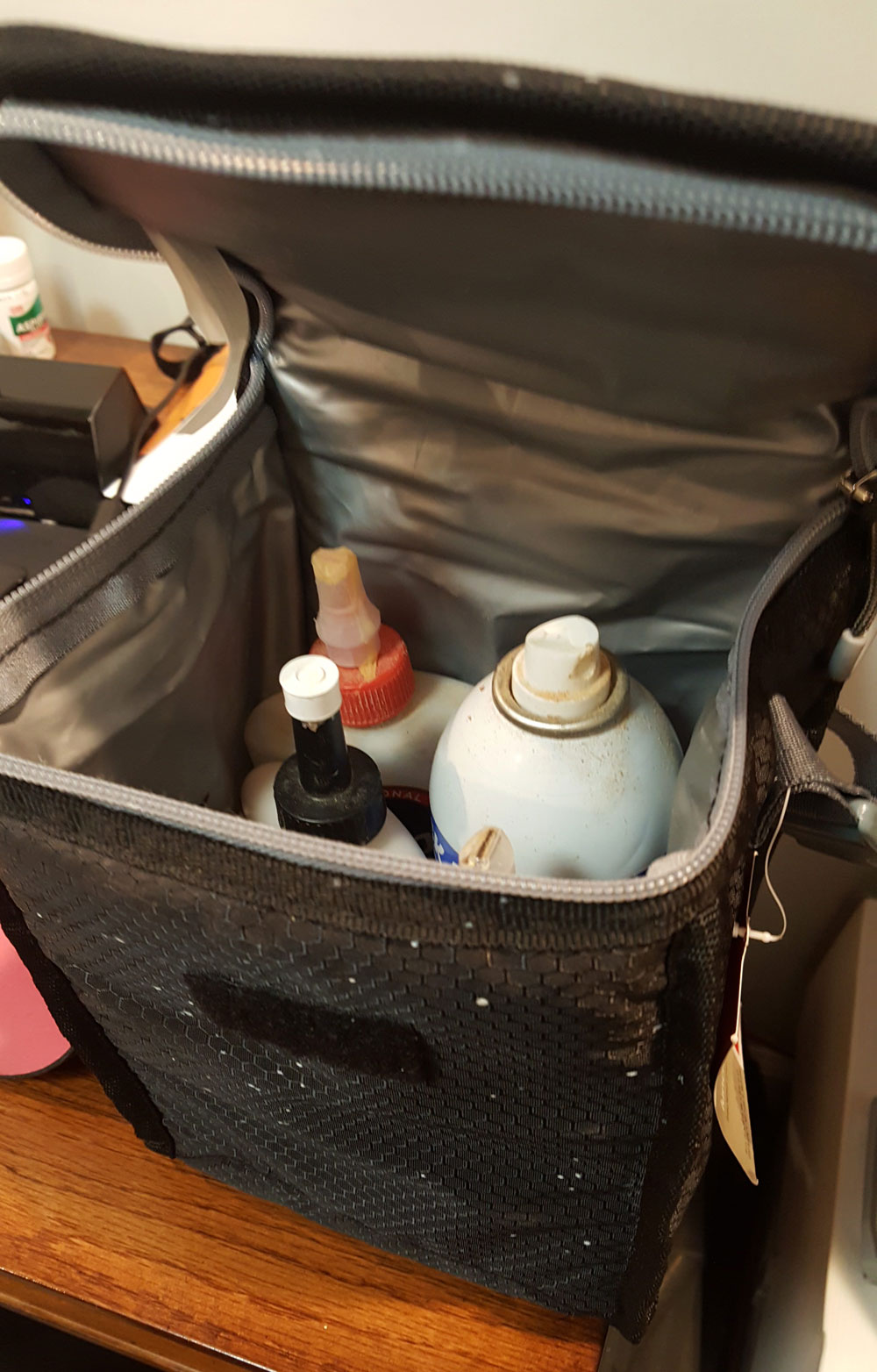 is done for. This has happened more than once, so this year I decided to fix the problem. Of course I can't fix my memory but this is the next best thing. I bought an insulated lunch bag from Target and it keeps the glue warm and snuggly on those cold nights. If it’s going to be a hard freeze but won’t be lasting too long the bag will protect the glue. It makes a handy carrying bag to bring into the house if needed, ready to grab and head back out to the shop when it warms up. Problem solved.