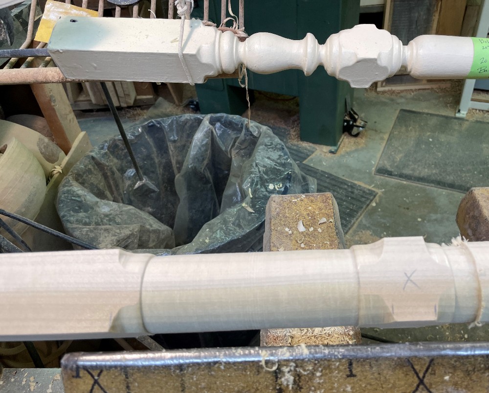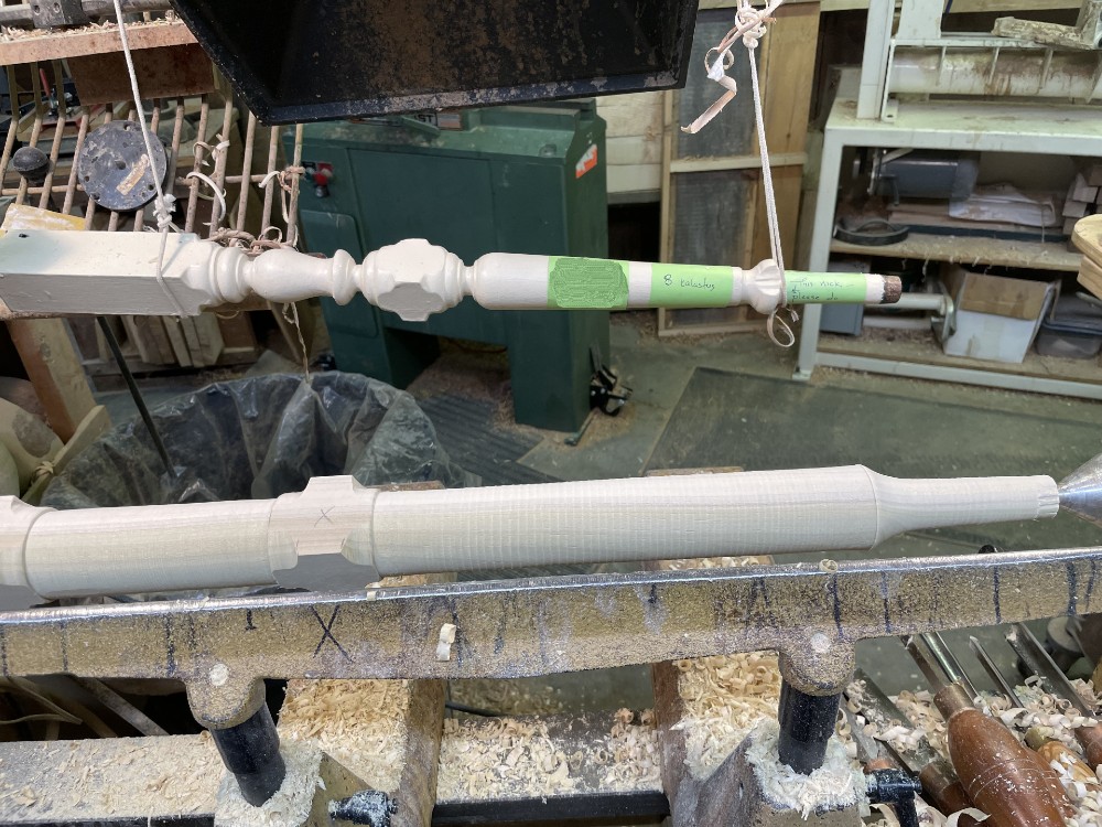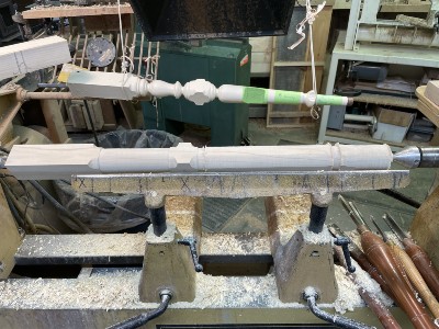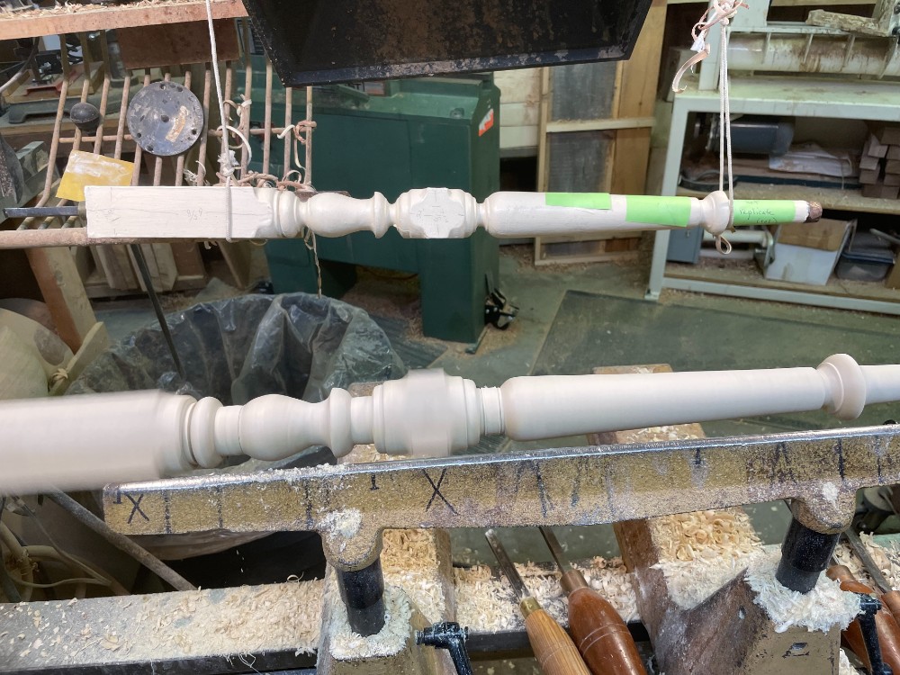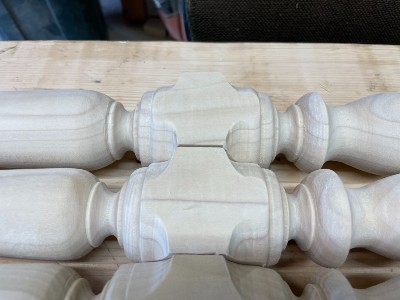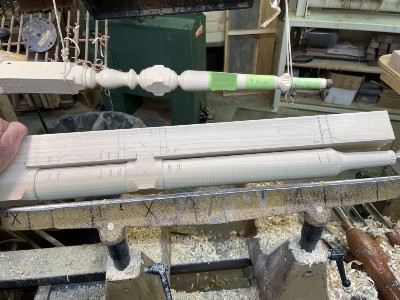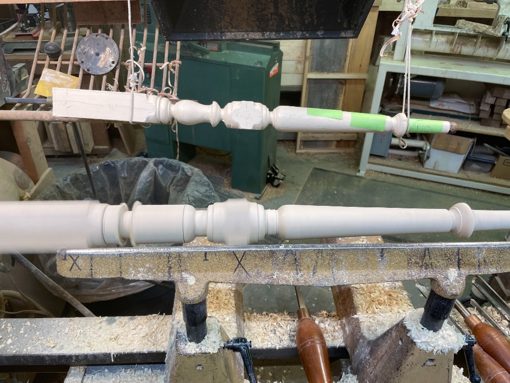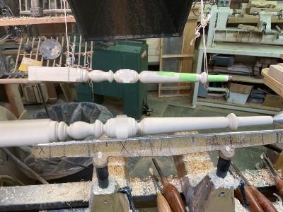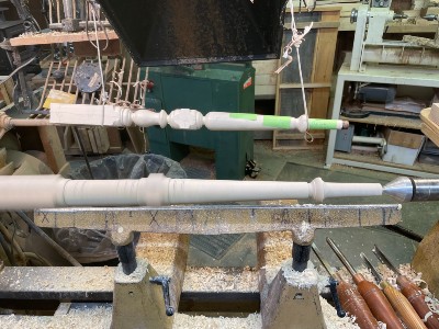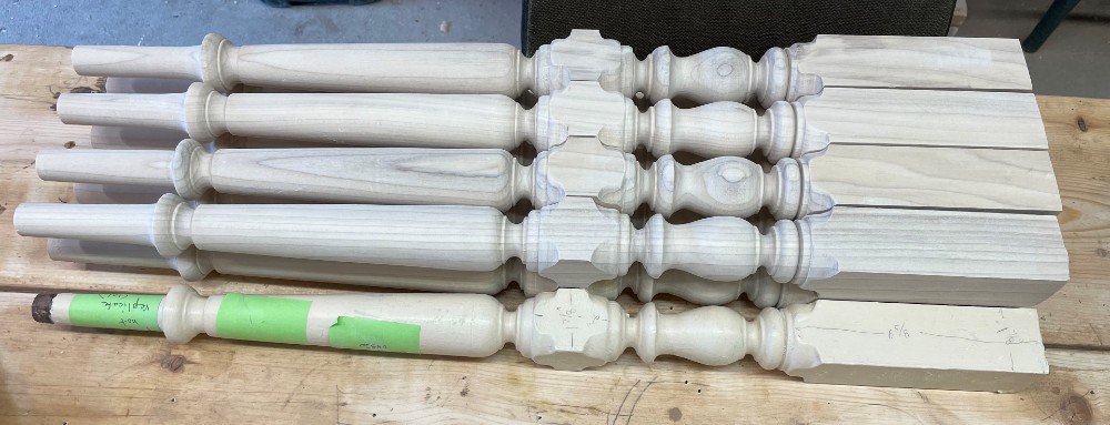 Through email, I corresponded with the customer who packaged up and sent the sample. He wanted to have the copied balusters turned from 1-7/8" X 1-7/8" X 29-1/4" poplar which he planned to paint to match his existing balustrade. When I received the mailing tube and opened the package, I found the sample with careful measured markings for each dimension with several pieces of green painter's tape – one marking a large chip (the void had been painted) missing from the top bead with the comment, "do not replace this chip-out." Later, I learned his wife had insisted on that special note and we probably talked more about that than any other feature. Humor often makes good friendships.